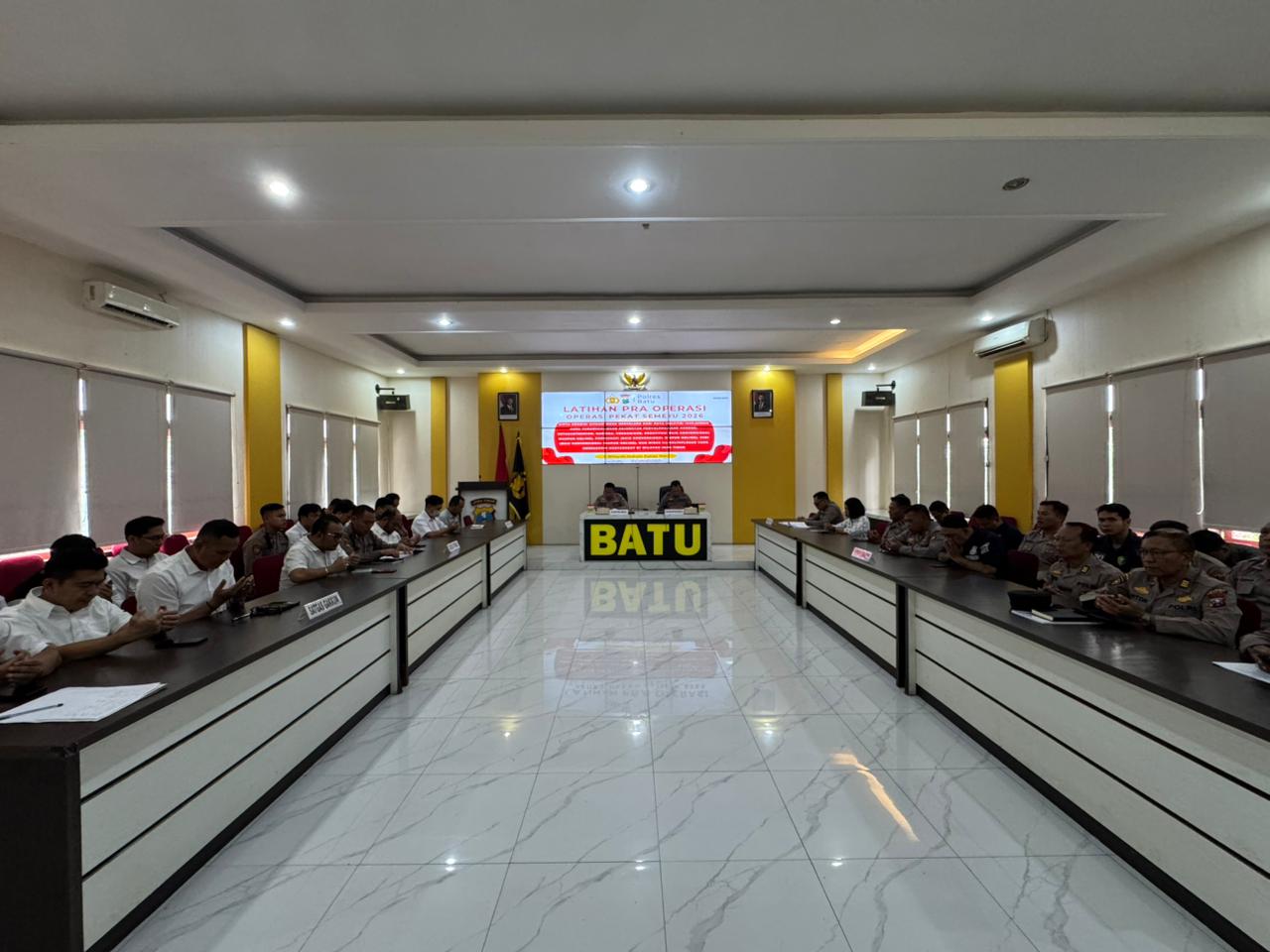 Lat Pra Ops Pekat Semeru 2026 dipimpin langsung Kapolres Batu, AKBP Dr. Aris Purwanto, S.H., S.I.K., M.H. bersama para Pejabat Utama (PJU) serta seluruh personel yang terlibat dalam operasi.